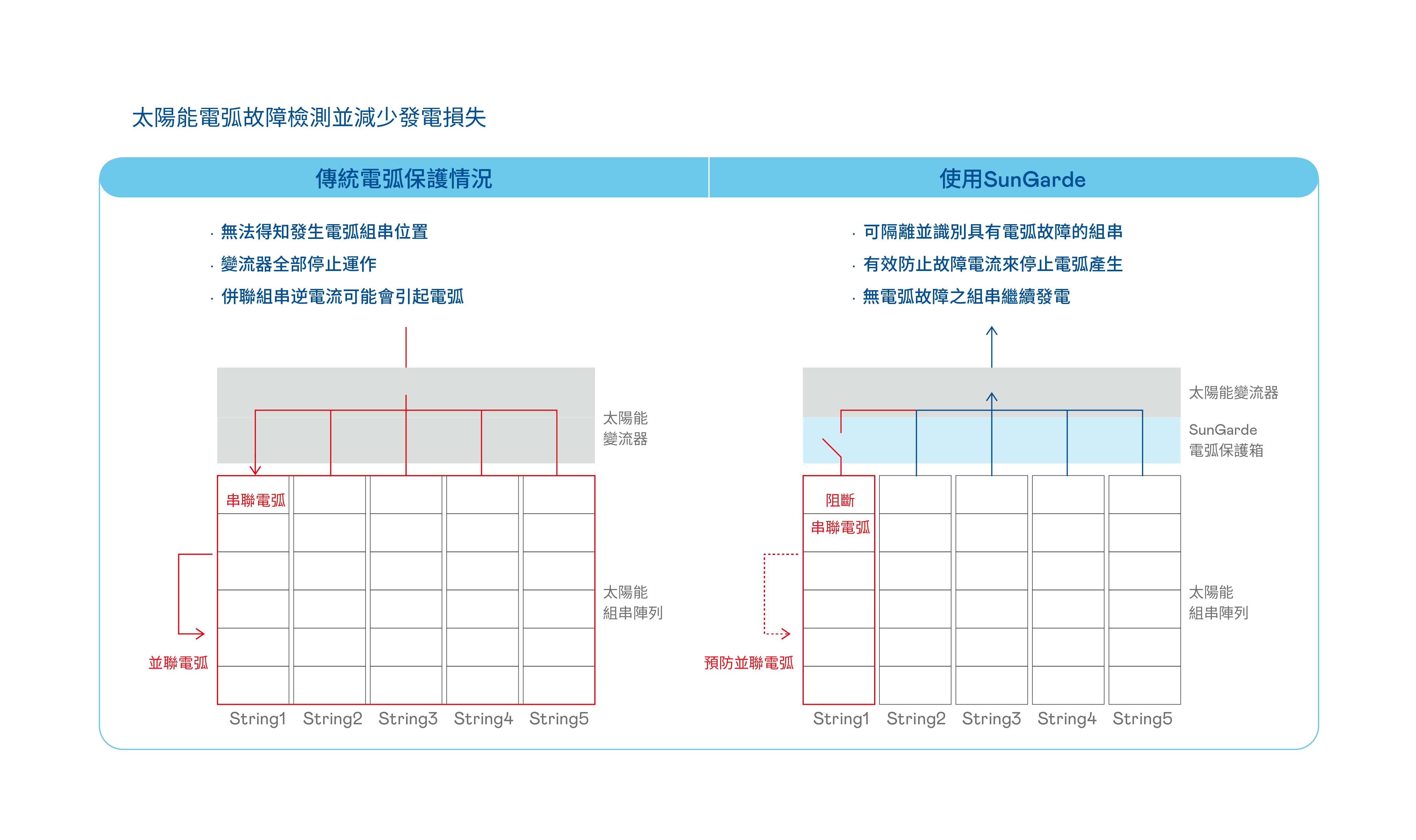 保護裝置偵測到電弧之後,將快速且準確辨識關斷故障組串,阻止串聯電弧發生、可大幅降低並聯電弧能量。透過SunVeillance組串級別發電熱力圖監控,利用視覺化分析組串發電效能不均,更容易找出故障組串(Fuse跳脫),來降低發電損失。