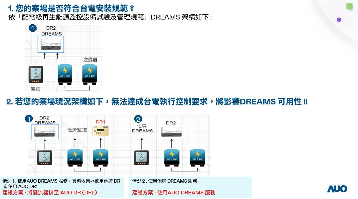 DREAMS 系統將自 114 年起制定每季控制功能演練流程,並規劃將控制演練結果納入可用性計算。請及早盤點案場設備與可靠度,以符合規範要求。詳細點位規範可參照附檔:台灣電力公司配電級再生能源監控設備 (再生能源監控設備 / 業者雲端資料系統) 與 DREAMS 傳輸需求技術規範摘要。
