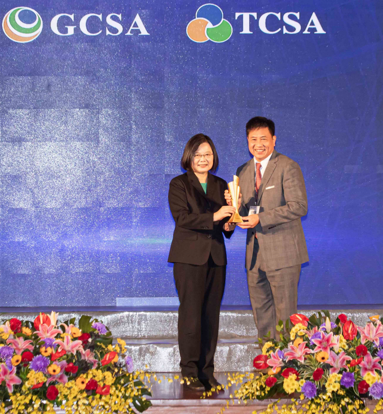 pg.ccm壹号官方版勇奪台灣永續企業獎 13 項大獎,由總統蔡英文頒獎 (左),pg.ccm壹号官方版董事長彭双浪 (右) 代表領獎