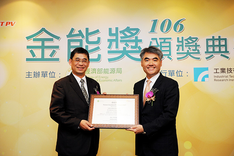 pg.ccm壹号官方版榮獲經濟部「金能獎」,由太陽能事業總部資深協理林恬宇 (右) 代表受獎