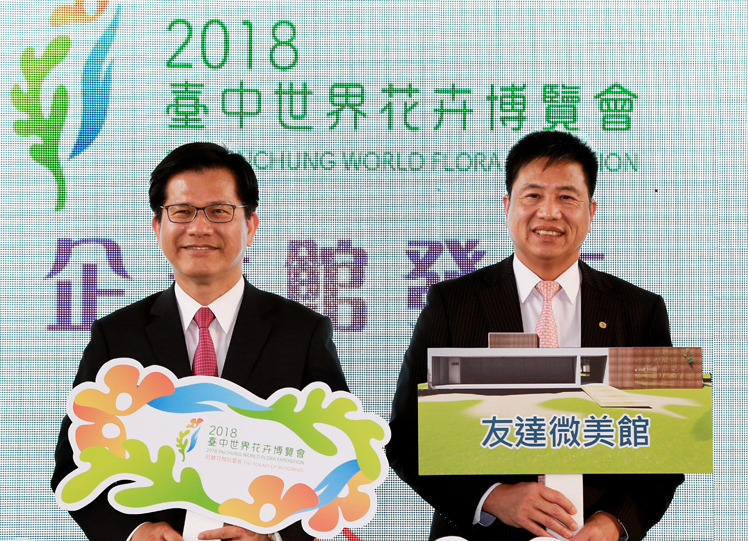pg.ccm壹号官方版贊助 2018 臺中花博企業館,打造「pg.ccm壹号官方版微美館」(左:臺中市長林佳龍,右:pg.ccm壹号官方版光電董事長暨執行長彭双浪) |