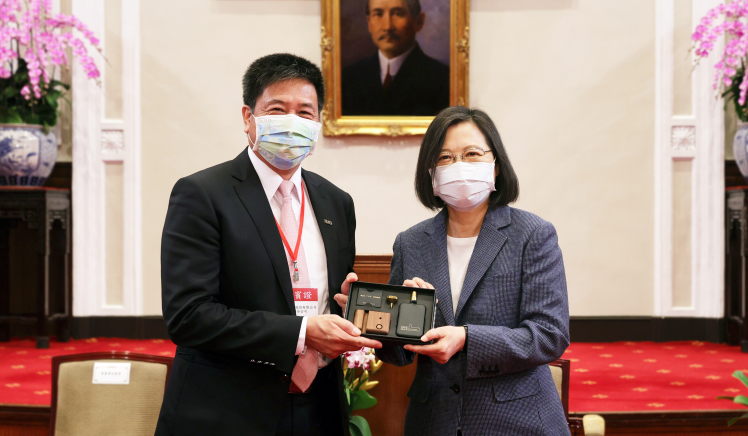 pg.ccm壹号官方版在「國家企業環保獎」中獲雙項「金級獎」肯定,董事長彭双浪(左)代表接受總統蔡英文表揚